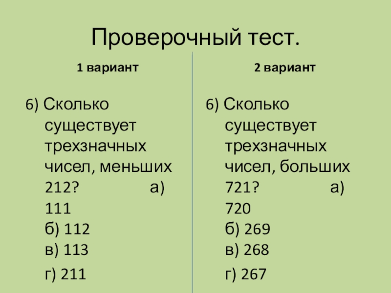 6) Сколько существует трехзначных чисел, меньших 212? а) 111 б) 112 в) 113