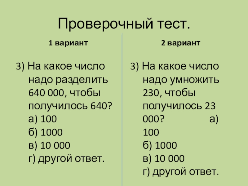3) На какое число надо разделить 640 000, чтобы получилось 640? а) 100 б) 1000 в) 10 000 г) другой ответ.
