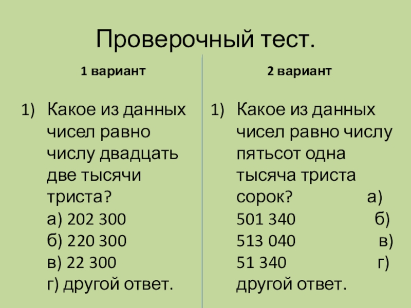 Какое из данных чисел равно числу двадцать две тысячи триста? а) 202 300 б) 220 300 в) 22 300 г) другой ответ.