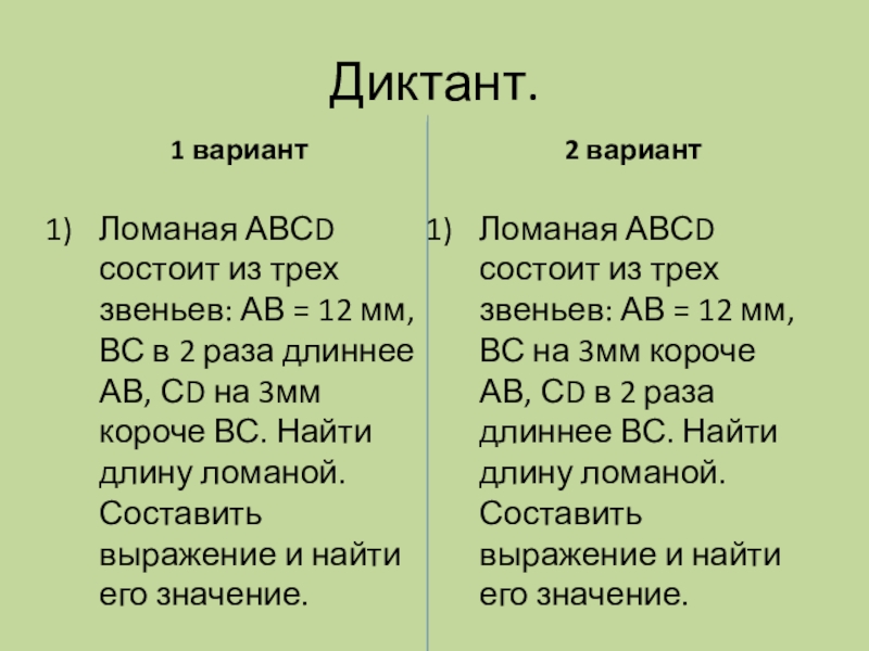 Ломаная АВСD состоит из трех звеньев: АВ = 12 мм, ВС в 2 раза длиннее АВ, СD на 3мм короче ВС. Найти длину ломаной. Составить выражение и найти его значение.