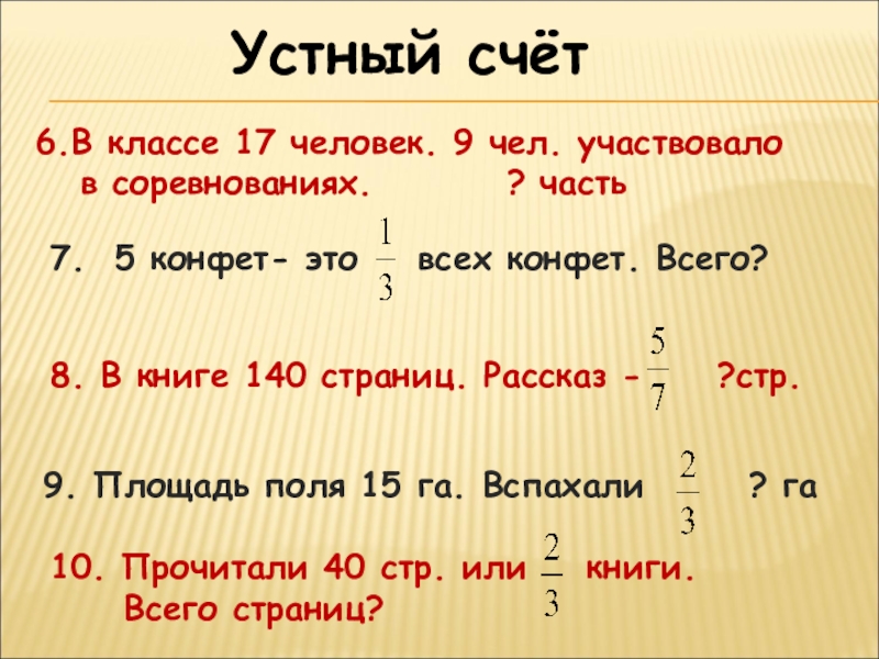 9. Площадь поля 15 га. Вспахали ? га