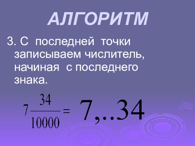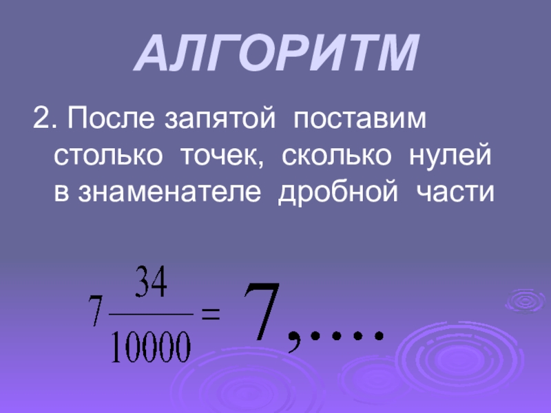 АЛГОРИТМ2. После запятой поставим столько точек, сколько нулей в знаменателе дробной части
