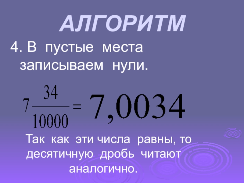 АЛГОРИТМ4. В пустые места записываем нули.  Так как эти числа равны, то десятичную дробь читают аналогично.