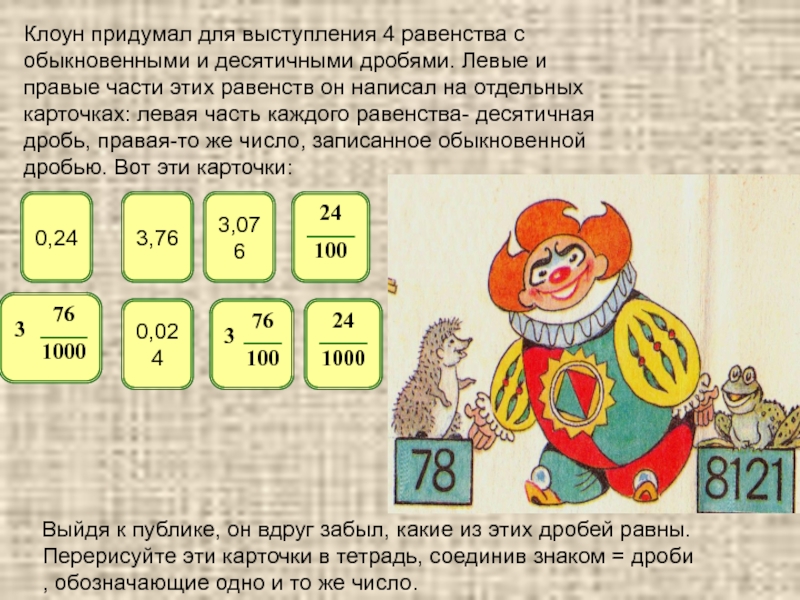 Выйдя к публике, он вдруг забыл, какие из этих дробей равны. Перерисуйте эти карточки в тетрадь, соединив знаком = дроби , обозначающие одно и то же число.