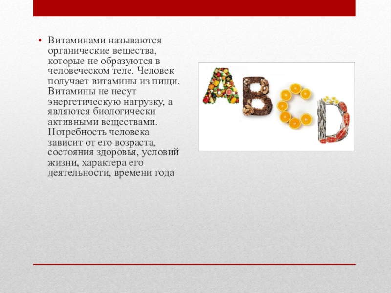 получает витамины из пищи. Витамины не несут энергетическую нагрузку, а являются биологически активными веществами. Потребность человека зависит от его возраста, состояния здоровья, условий жизни, характера его деятельности, времени года