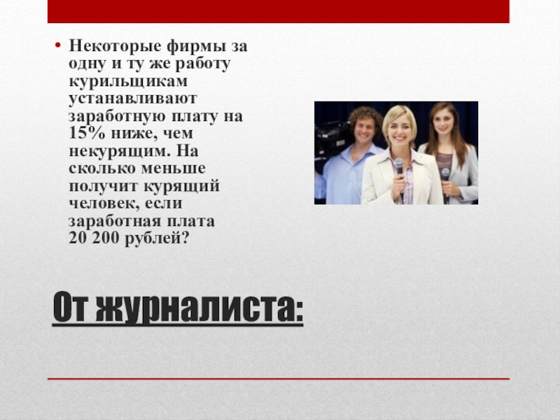 заработную плату на 15% ниже, чем некурящим. На сколько меньше получит курящий человек, если заработная плата 20 200 рублей?