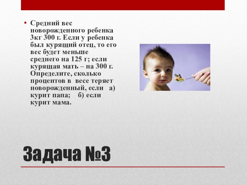был курящий отец, то его вес будет меньше среднего на 125 г; если курящая мать – на 300 г. Определите, сколько процентов в весе теряет новорожденный, если а) курит папа; б) если курит мама.