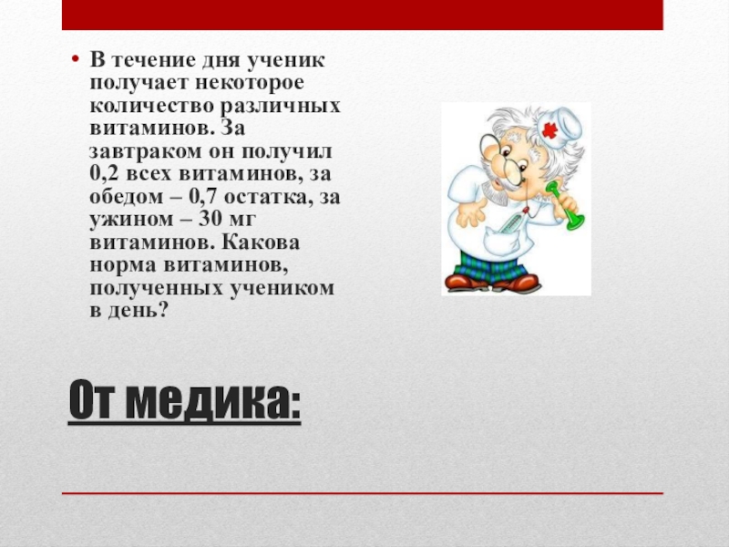завтраком он получил 0,2 всех витаминов, за обедом – 0,7 остатка, за ужином – 30 мг витаминов. Какова норма витаминов, полученных учеником в день?