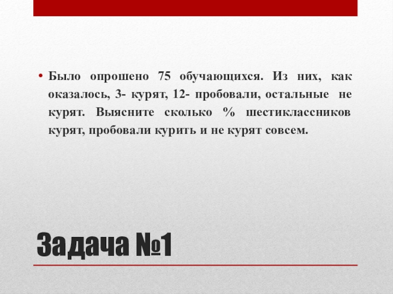 12- пробовали, остальные не курят. Выясните сколько % шестиклассников курят, пробовали курить и не курят совсем.