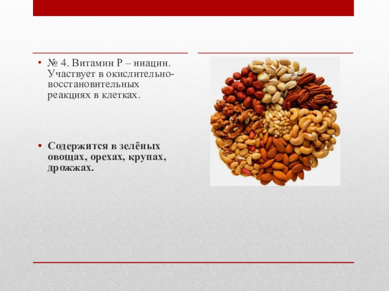 Слайд 20№ 4. Витамин Р – ниацин. Участвует в окислительно-восстановительных реакциях в
