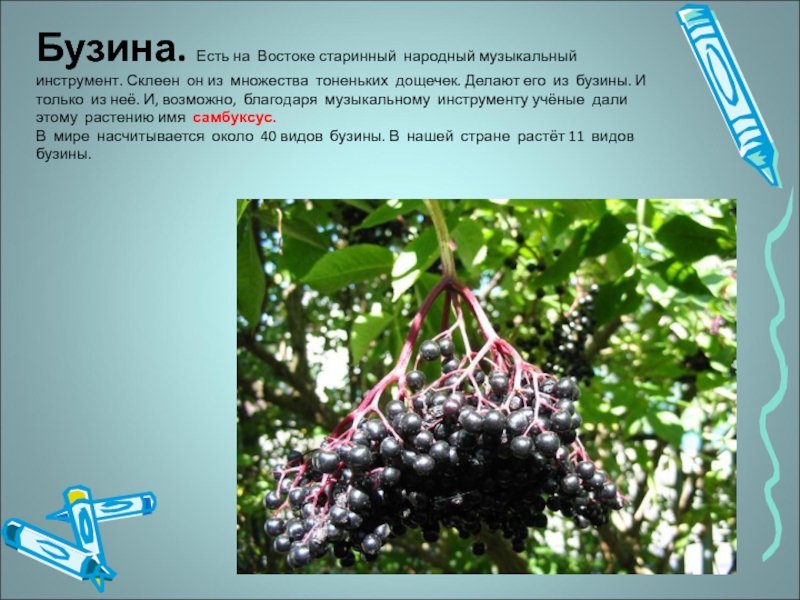 Слайд 9Бузина. Есть на Востоке старинный народный музыкальный инструмент. Склеен он из