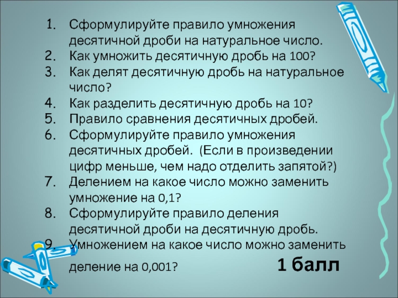Слайд 5Сформулируйте правило умножения десятичной дроби на натуральное число.