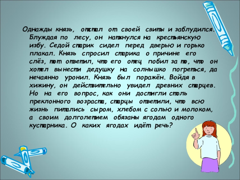 лесу, он наткнулся на крестьянскую избу. Седой старик сидел перед дверью и горько плакал. Князь спросил старика о причине его слёз, тот ответил, что его отец побил за то, что он хотел вынести дедушку на солнышко погреться, да нечаянно уронил. Князь был поражён. Войдя в хижину, он действительно увидел древних старцев. Но на его вопрос, как они достигли столь преклонного возраста, старцы ответили, что всю жизнь питались сыром, хлебом с солью и молоком, а своим долголетием обязаны ягодам одного кустарника. О каких ягодах идёт речь?