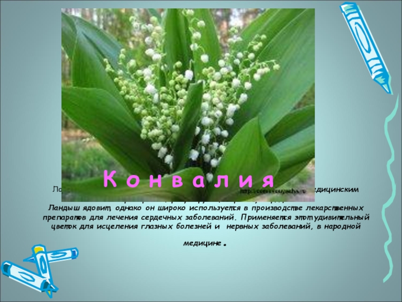 Ландыш ядовит, однако он широко используется в производстве лекарственных препаратов для лечения сердечных заболеваний. Применяется этот удивительный цветок для исцеления глазных болезней и нервных заболеваний, в народной медицине.
