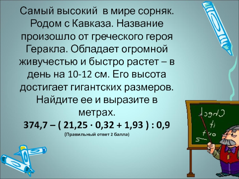 греческого героя Геракла. Обладает огромной живучестью и быстро растет – в день на 10-12 см. Его высота достигает гигантских размеров. Найдите ее и выразите в метрах.