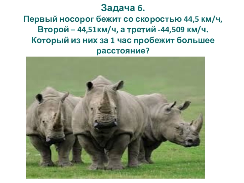 Задача 6. Первый носорог бежит со скоростью 44,5 км/ч,  Второй – 44,51км/ч, а третий -44,509 км/ч.