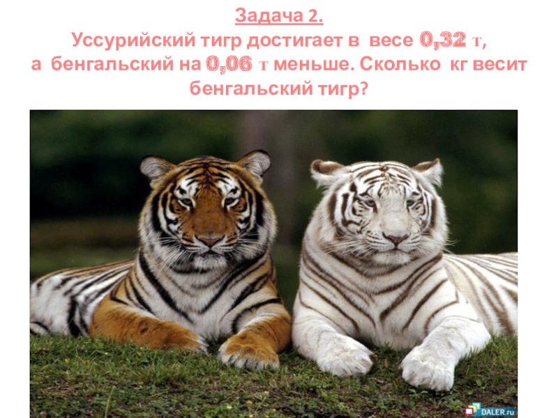 Слайд 3Задача 2. Уссурийский тигр достигает в весе 0,32 т, а бенгальский на 0,06