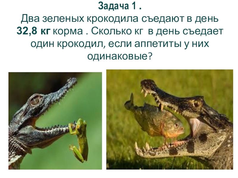 Слайд 2Задача 1 . Два зеленых крокодила съедают в день 32,8 кг корма