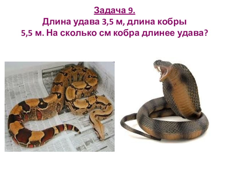 Слайд 8Задача 9. Длина удава 3,5 м, длина кобры 5,5 м. На сколько