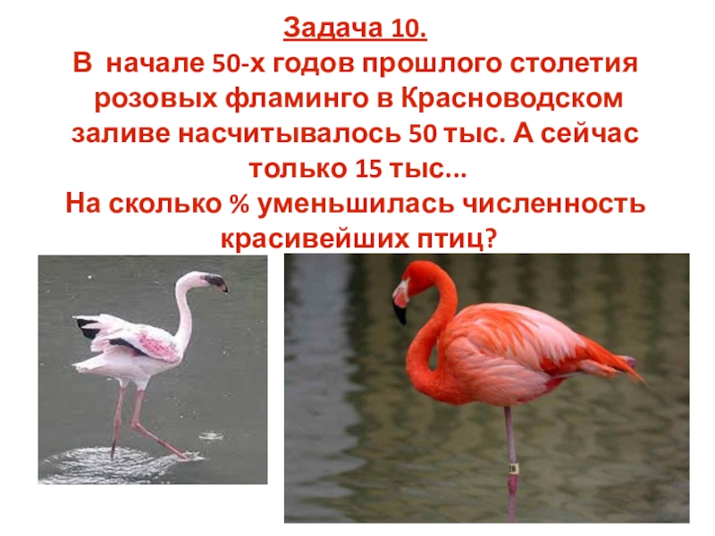Слайд 9Задача 10. В начале 50-х годов прошлого столетия розовых фламинго в Красноводском