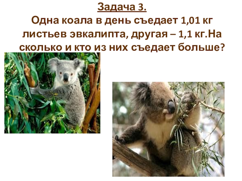 Слайд 4Задача 3. Одна коала в день съедает 1,01 кг листьев эвкалипта, другая