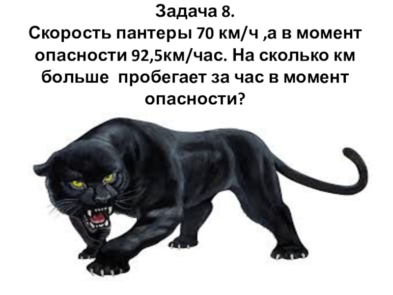 Слайд 7Задача 8. Скорость пантеры 70 км/ч ,а в момент опасности 92,5км/час. На
