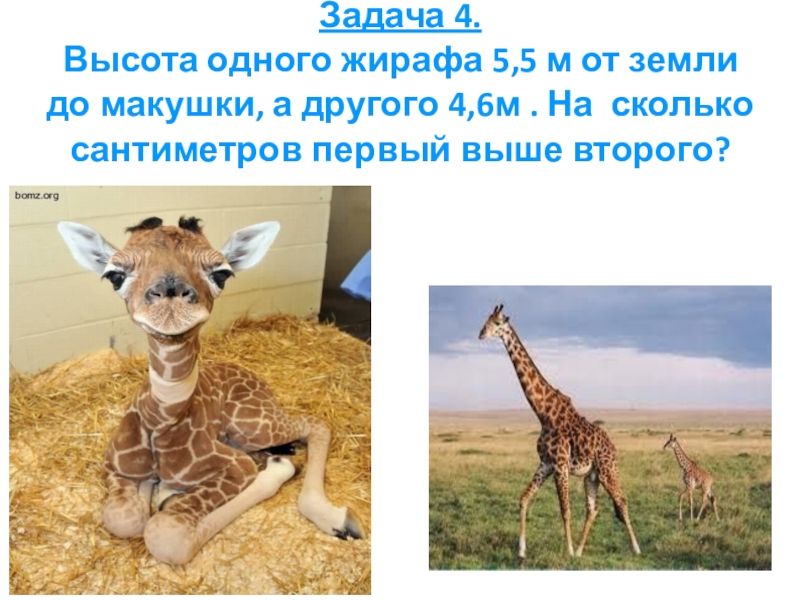 Задача 4. Высота одного жирафа 5,5 м от земли до макушки, а другого 4,6м . На сколько