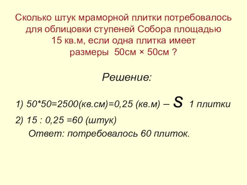 1) 50*50=2500(кв.см)=0,25 (кв.м) – s 1 плитки