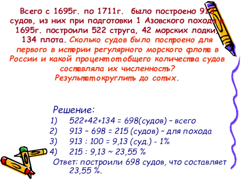 Ответ: построили 698 судов, что составляет 23,55 %.