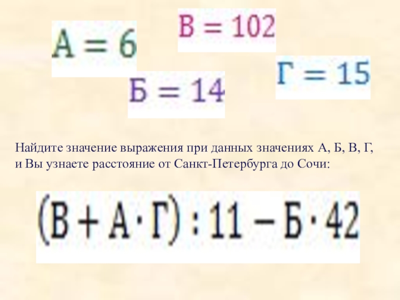 Найдите значение выражения при данных значениях А, Б, В, Г, и Вы узнаете расстояние от Санкт-Петербурга до