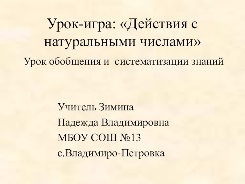 Урок-игра: «Действия с натуральными числами» Урок обобщения и систематизации знаний			Учитель Зимина 			Надежда Владимировна			МБОУ СОШ №13			с.Владимиро-Петровка