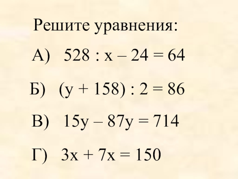 А)  528 : х – 24 = 64Б)  (у + 158) : 2 = 86В)