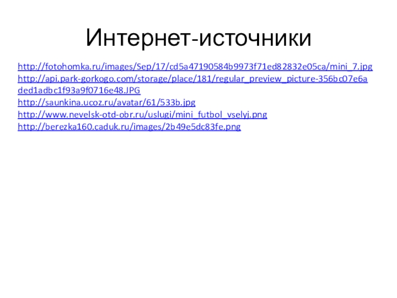 Интернет-источникиhttp://fotohomka.ru/images/Sep/17/cd5a47190584b9973f71ed82832e05ca/mini_7.jpghttp://api.park-gorkogo.com/storage/place/181/regular_preview_picture-356bc07e6aded1adbc1f93a9f0716e48.JPGhttp://saunkina.ucoz.ru/avatar/61/533b.jpghttp://www.nevelsk-otd-obr.ru/uslugi/mini_futbol_vselyj.pnghttp://berezka160.caduk.ru/images/2b49e5dc83fe.png