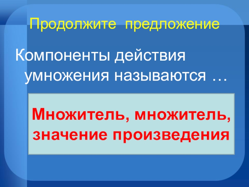 Продолжите предложениеКомпоненты действия умножения называются …Множитель, множитель, значение произведения