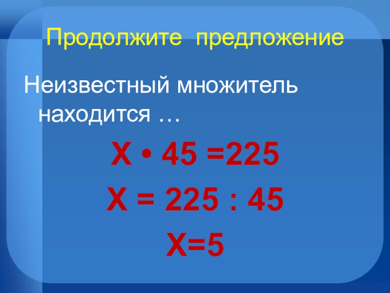 Продолжите предложениеНеизвестный множитель находится …Х • 45 =225Х = 225 : 45Х=5