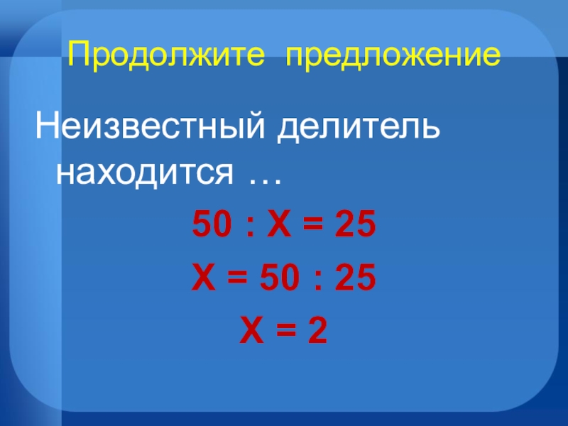 Продолжите предложениеНеизвестный делитель находится …50 : Х = 25Х = 50 : 25Х = 2