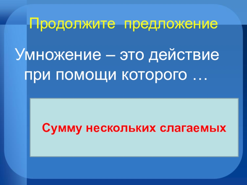 Продолжите предложениеУмножение – это действие при помощи которого …Сумму нескольких слагаемых