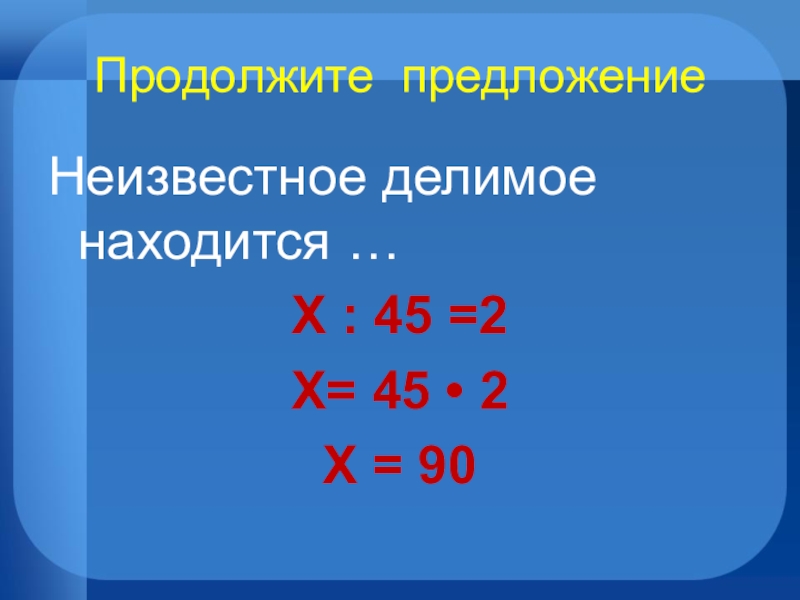 Продолжите предложениеНеизвестное делимое находится …Х : 45 =2Х= 45 • 2Х = 90