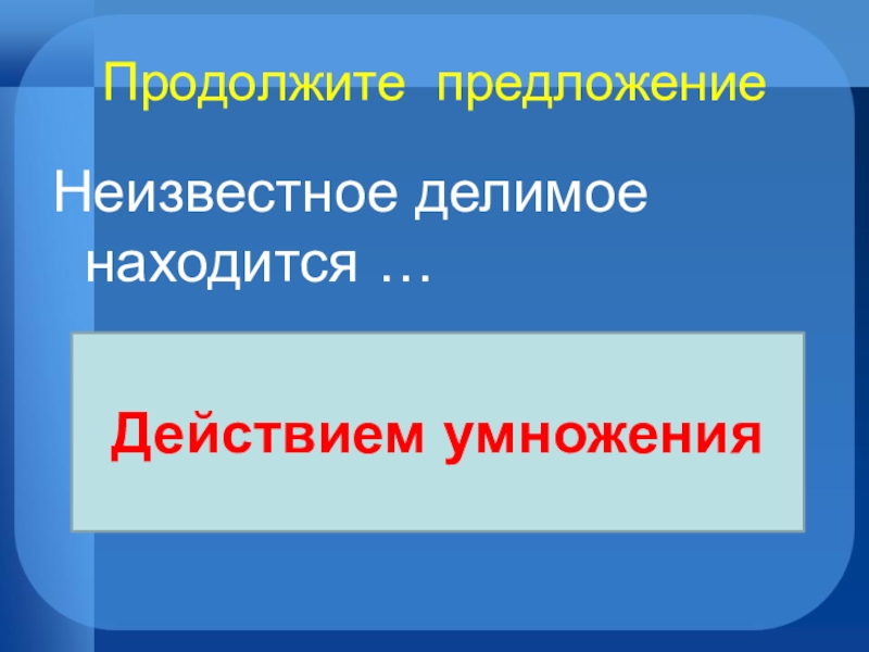 Продолжите предложениеНеизвестное делимое находится …Действием умножения