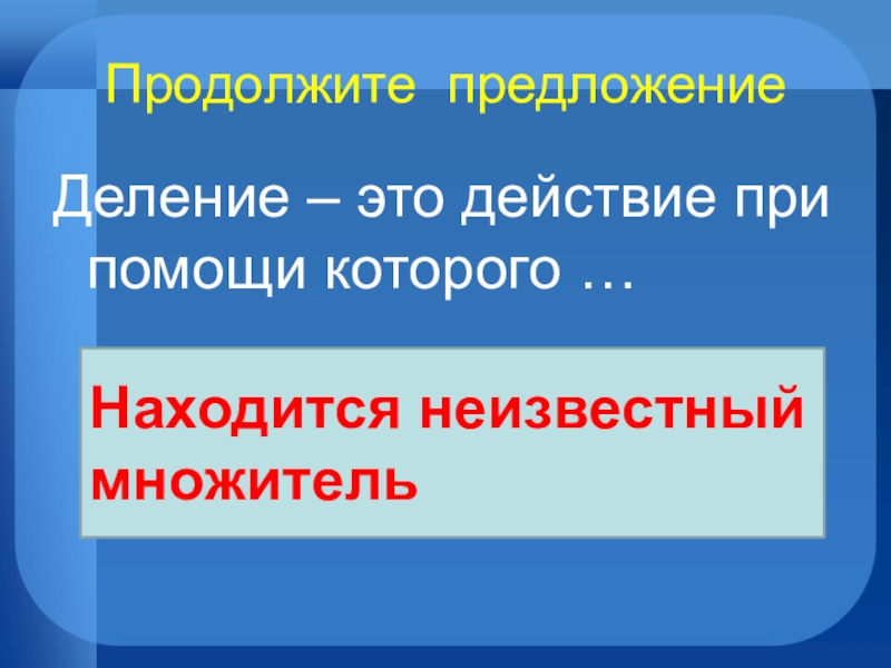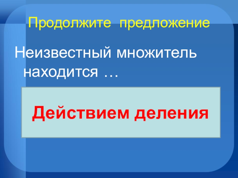 Продолжите предложениеНеизвестный множитель находится …Действием деления