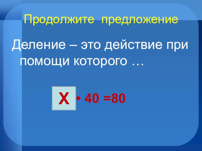 Продолжите предложениеДеление – это действие при помощи которого …• 40 =80Х