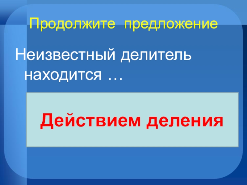Продолжите предложениеНеизвестный делитель находится …Действием деления