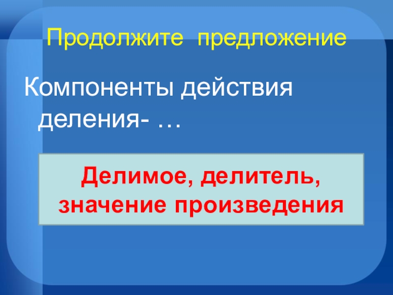 Продолжите предложениеКомпоненты действия деления- …Делимое, делитель, значение произведения
