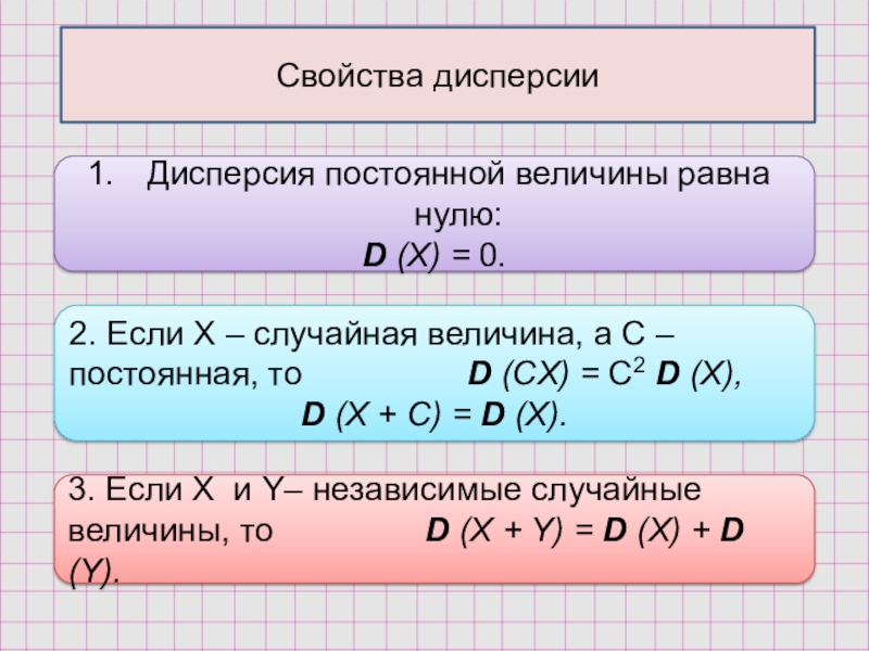 3. Если Х и Y– независимые случайные величины, то D (X + Y) = D (X) + D (Y).