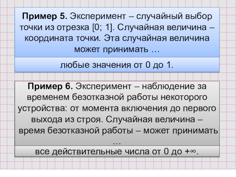 Пример 6. Эксперимент – наблюдение за временем безотказной работы некоторого устройства: от момента включения до первого выхода из строя. Случайная величина – время безотказной работы – может принимать …