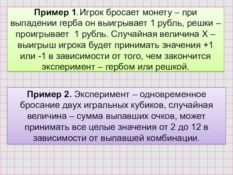 Пример 2. Эксперимент – одновременное бросание двух игральных кубиков, случайная величина – сумма выпавших очков, может принимать все целые значения от 2 до 12 в зависимости от выпавшей комбинации.