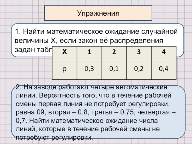 2. На заводе работают четыре автоматические линии. Вероятность того, что в течение рабочей смены первая линия не потребует регулировки, равна 09, вторая – 0,8, третья – 0,75, четвертая – 0,7. Найти математическое ожидание числа линий, которые в течение рабочей смены не потребуют регулировки.