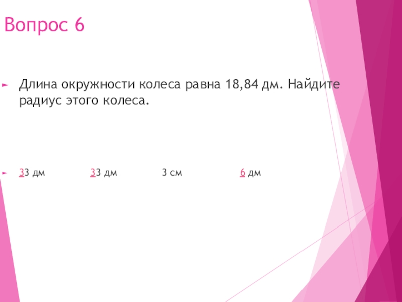 Длина окружности колеса равна 18,84 дм. Найдите радиус этого колеса.