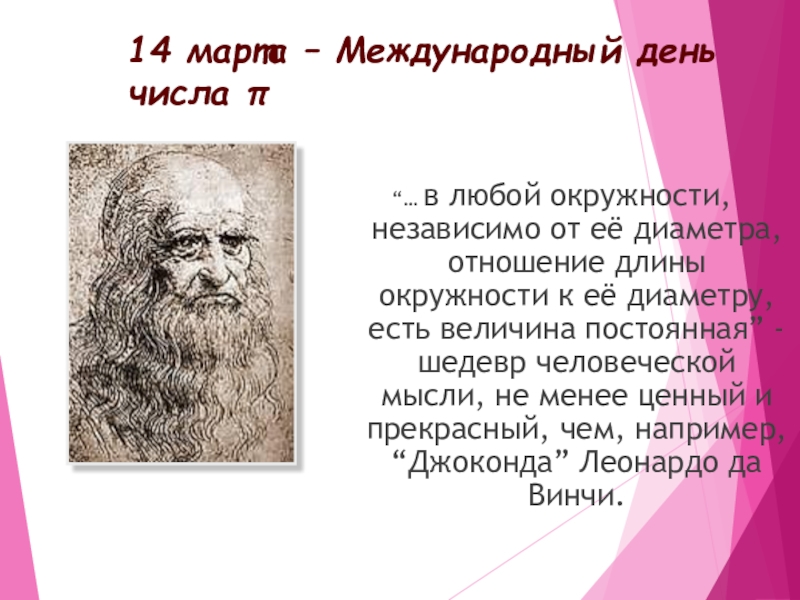 от её диаметра, отношение длины окружности к её диаметру, есть величина постоянная” - шедевр человеческой мысли, не менее ценный и прекрасный, чем, например, “Джоконда” Леонардо да Винчи.