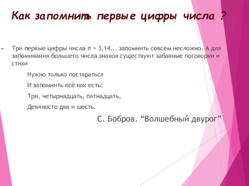 “Вот и знаю я число, именуемое Пи. – Молодец!” (π = “3,1415927);